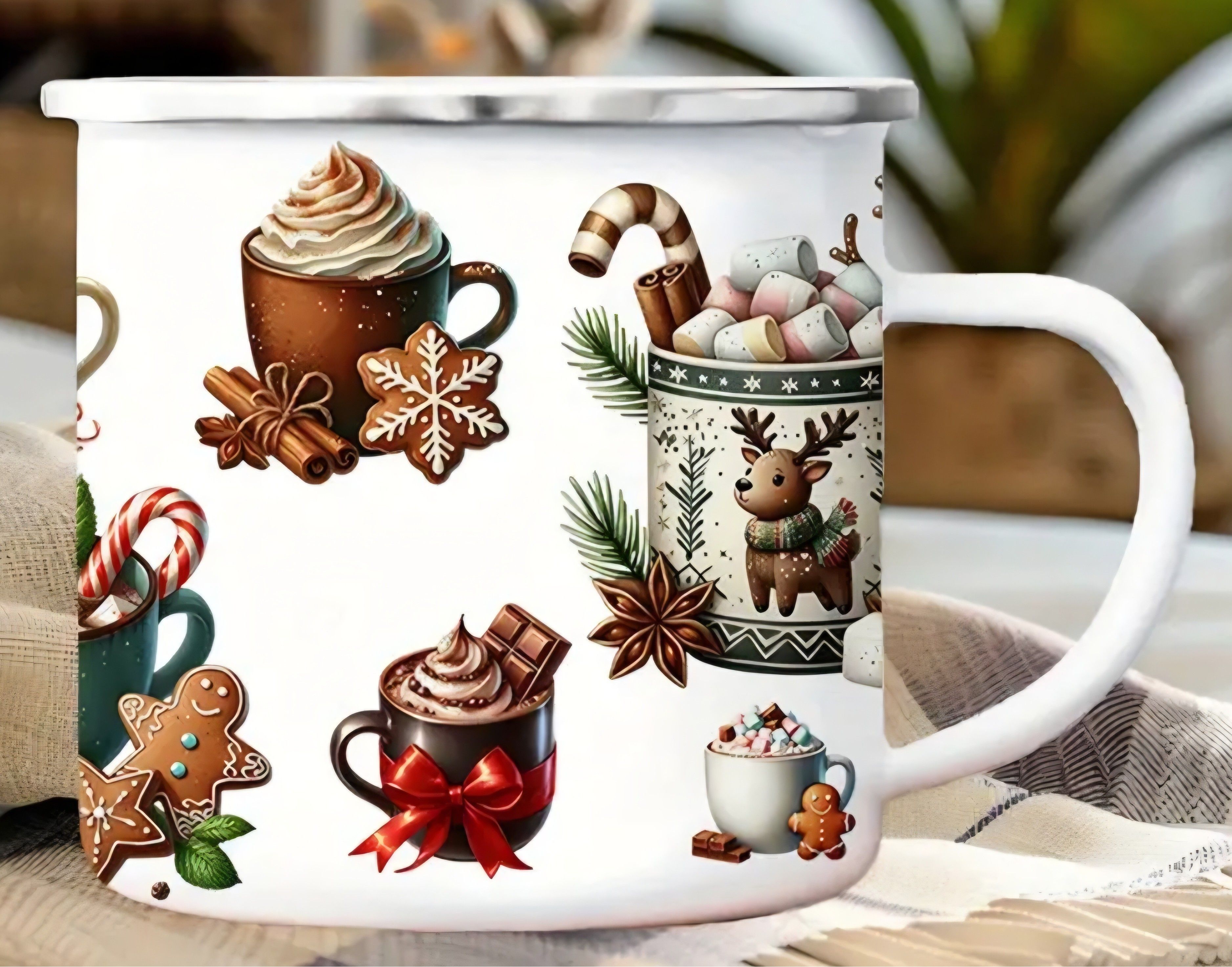 Each set includes: A delightful enamel Gingerbread mug, a co-ordinated set of coasters, a bag of Cadbury Hot Chocolate Powder, and a bag of fun pillowy marshmallows. It's truly the perfect treat for the holiday season. GF friendly.